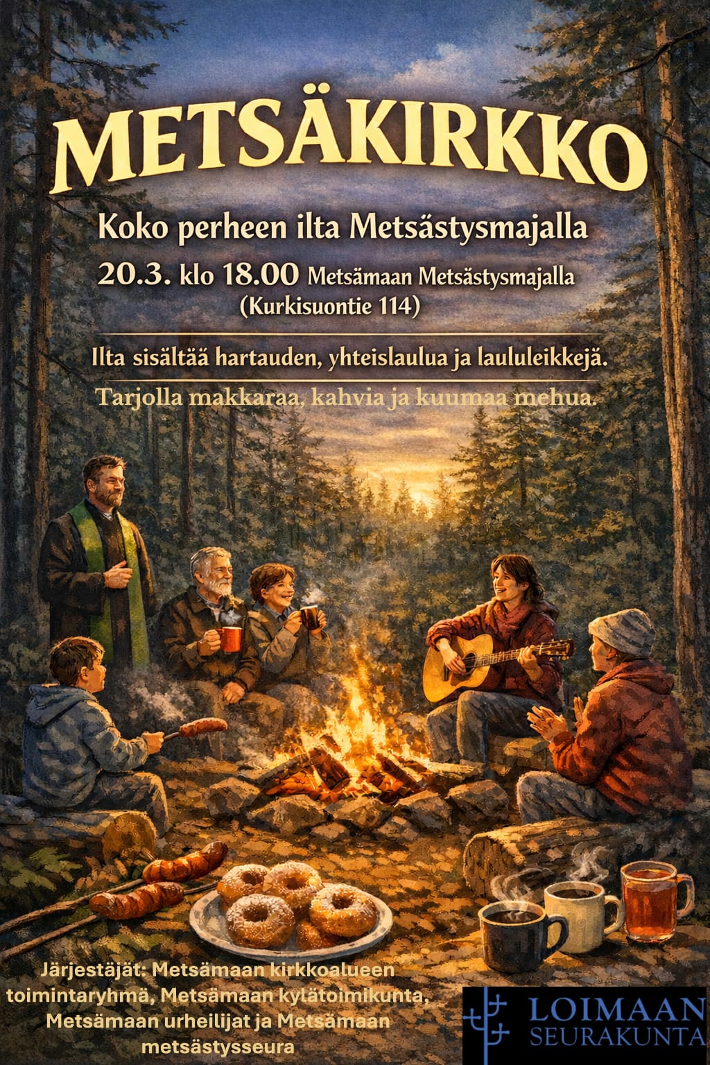 20.03.2026Tervetuloa metsäkirkkoon pe 20.3.2026 klo 18 Metsämaan metsästysmajalle!