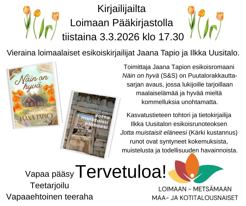 Kirjailijaillan järjestävät Loimaan-Metsämaan Maa- ja kotitalousnaiset ja pääkirjasto. Tilaisuus alkaa klo 17.30. Alussa on teetarjoilu. Esiintyjien kirjoja on myytävänä. Vapaa ja avoin pääsy kaikille.