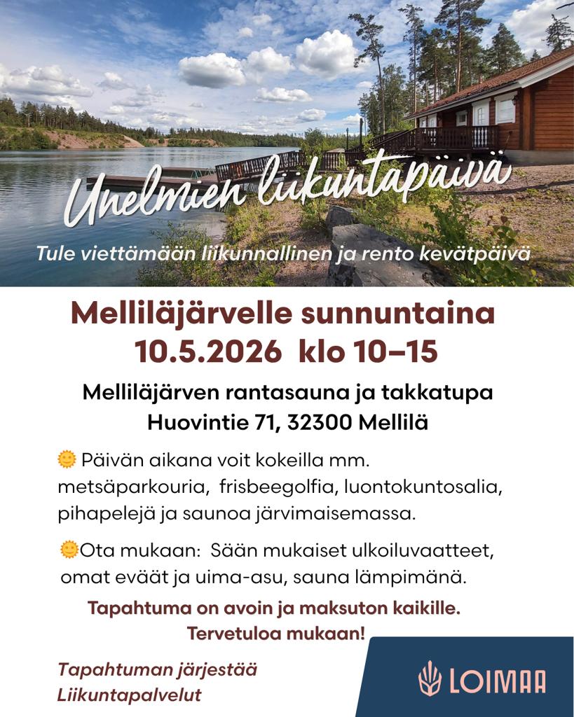 25.04.2026Loimaan Kauppala järjestää Hyvän mielen -teemaiset messut Loimaan Heimolinnassa lauantaina 25.4.2026 klo 10.00–16.00. Tapahtuma kokoaa yhteen eri alojen yrityksiä ja toimijoita – hyvä mieli voi syntyä niin palveluista, tuotteista, elämyksistä kuin arjen pienistä oivalluksistakin.