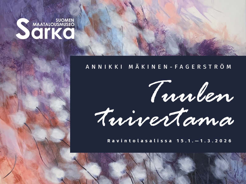 15.01.2026Sarka-museon Ravintolasalissa nähdään Annikki Mäkinen-Fagerströmin luontoaiheisia akryylitekniikalla tehtyjä maalauksia. Näyttelyn innoittajana on toiminut kaunis ja karu saariston luonto; tuulen ja jään kovertamat luonnon taideteokset kallioissa ja puissa. Nauvossa asuvaa taiteilijaa kiehtoo myös elämän epätäydellisyys ja sattumanvaraisuus. ”Tuuli kuljettaa sinne ja tänne.” Mäkinen-Fagerström avaa ajatuksiaan teosten takana. ”Aina ei ole niin helppoa, mutta elämä on tarkoitettu elettäväksi kaikkine kokemuksineen”.