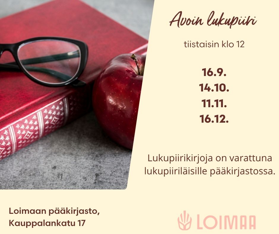 16.12.2025Avoimessa lukupiirissä luetaan kirja etukäteen ja keskustellaan siitä. Lukupiirin vetäjänä toimii Tarja Nikander. Lukupiiri kokoontuu pääkirjastossa kerran kuukaudessa tiistaisin klo 12. Lukupiirikirjoja on varattuna lukupiiriläisille pääkirjastossa.