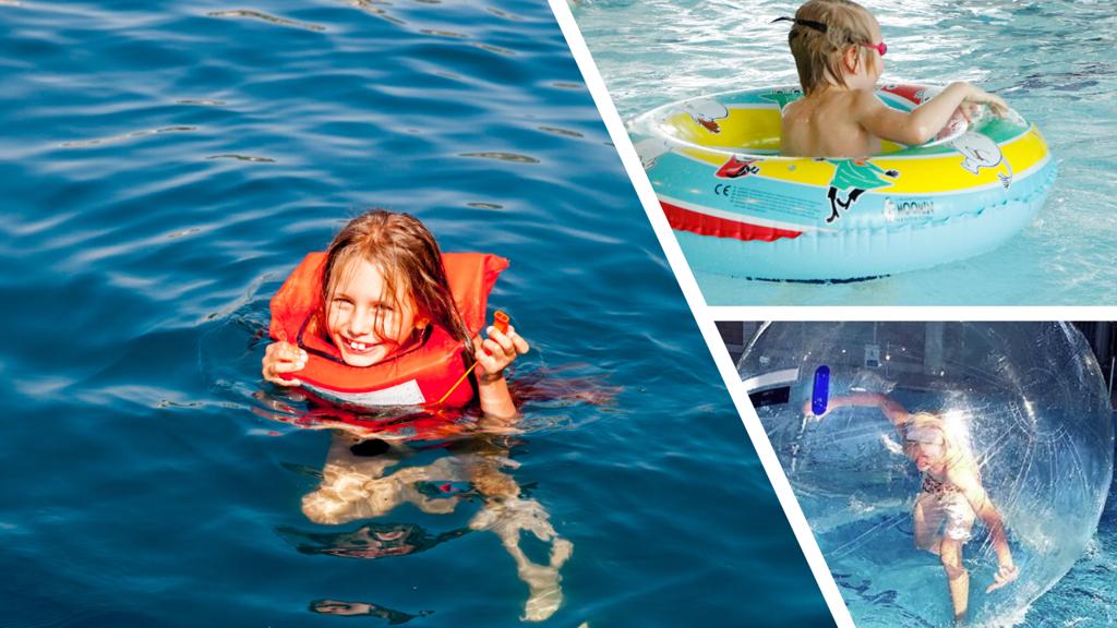 Uinti- ja leikkivälineet vapaassa käytössä isossa altaassa kahdella radalla ja monitoimialtaan opetusosassa.